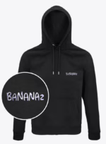 Step into the enchanting world of “Night Magic,” a black hoodie designed to capture the spirit of adventure and the magic of the great outdoors. Imagine the crisp night air, the glow of a crescent moon, and the soft murmur of a flowing river under a sky filled with stars. On the back of this hoodie, a vibrant illustration brings this vision to life: two whimsical banana characters sitting by a crackling campfire, surrounded by majestic purple-hued mountains and a serene campsite. It’s a scene that invites you to pause, connect with nature, and rediscover the simple joys of life under the stars.